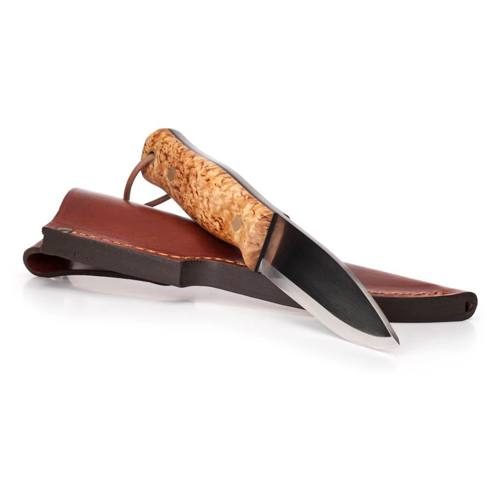 Das Lars Fält Knife von Casström ist ein hochwertiges Bushcraft Messer mit edlem Design. Die Klinge mit hohem Carbon-Anteil ist besonders hart und extrem Schnittfest. Sie kann problemlos zum Holzspalten oder Feuermachen genutzt werden. Der skandinavische Schliff eignet sich sehr gut zum Schnitzen und lässt sich ohne allzu großen Aufwand nachschärfen. Ein Griff aus Birkenholz sorgt für eine edle Optik und eine gute Ergonomie beim Arbeiten mit dem Messer. In der Lederscheide kann es sicher aufbewahrt werden.