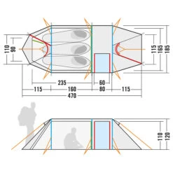 Das Innenzelt ist für Längsschläfer konzipiert. Die extra lange Liegefläche ist mit 235 Zentimetern selbst für große Personen bestens geeignet. Das Innenzelt ist mit zwei Eingängen ausgestattet. Einer davon ist mit einem Moskitonetz versehen, damit fliegende Plagegeister nicht hereinkommen. In den seitlichen Einstecktaschen können Gegenstände organisiert, die jeder Zeit schnell erreichbar sein sollen. Zusätzlich gibt es eine Himmeltasche und eine Wäscheleine im Innenzelt. An ihr kann feuchte Kleidung problemlos aufgehängt werden.